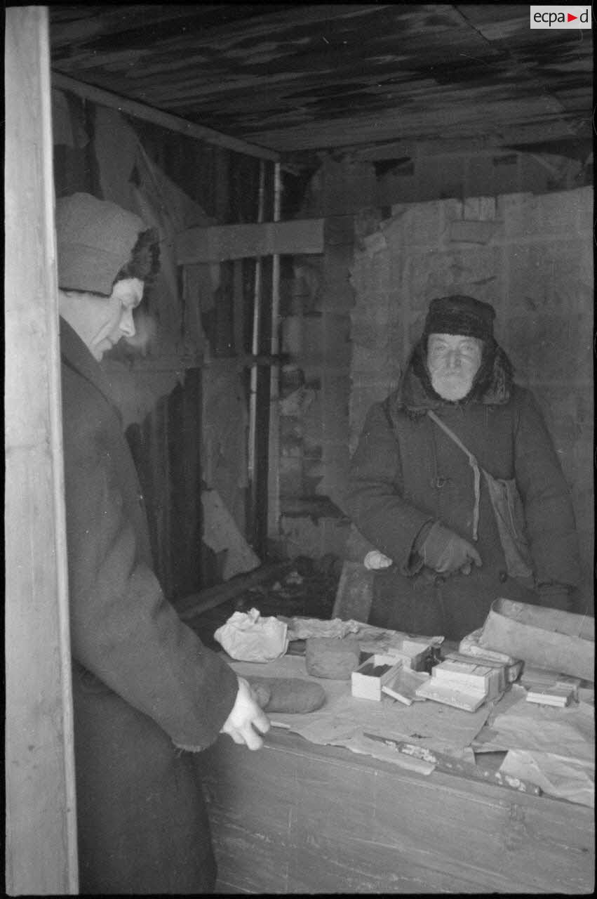 Des permissionnaires allemands s'apprêtent à monter à bord d'un camion. Les berges gelées d'une rivière dans laquelle sont figés des bateaux de pêche. La Standortkommandantur de Witebsk (Kommandantur). Un horloger et son enseigne bilingue allemand et russe.