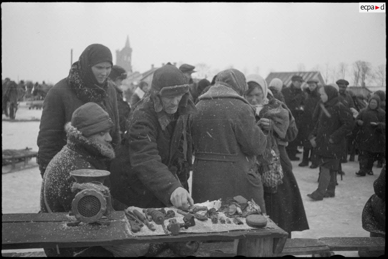 Sur une place de Vitebsk (Witebsk), la circulation est assurée par Feldgendarme, on reconnaît sa plaque hausse-col. Des femmes issues de la minorité allemande, ou qui travaillent pour l'occupant, sourient au photographe qui les immortalise. A la gare de Vitebsk (Witebsk), des permissionnaires de retour de leur foyer vont rejoindre leur garnison. Les soldats déposent leur paquetage sur un traineau pour en faciliter le transport. Les traineaux sont tractés par des enfants qui échangent leur service contre du pain ou des cigarettes.