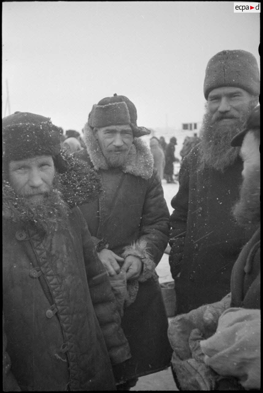 Des permissionnaires allemands s'apprêtent à monter à bord d'un camion. Les berges gelées d'une rivière dans laquelle sont figés des bateaux de pêche. La Standortkommandantur de Witebsk (Kommandantur). Un horloger et son enseigne bilingue allemand et russe.