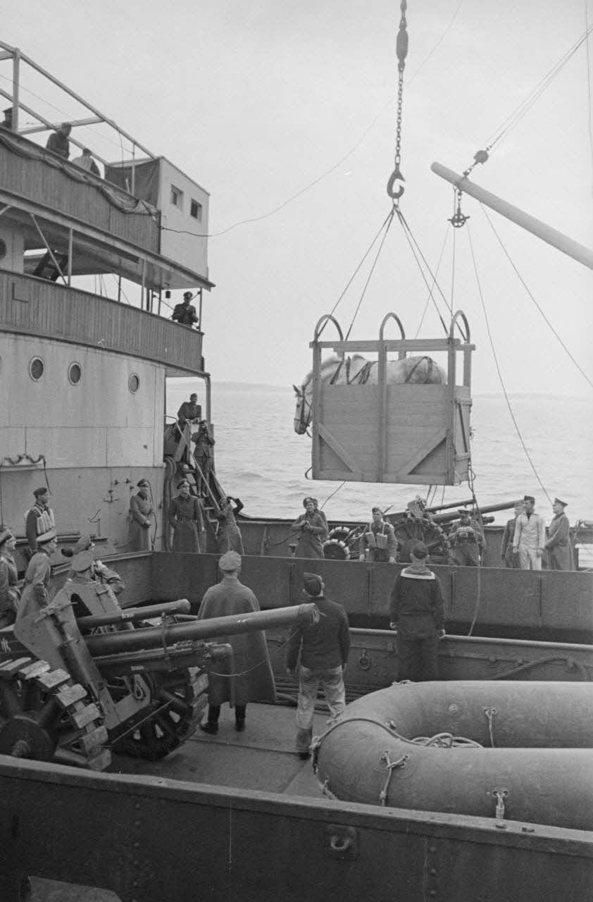 Dans le cadre de l'opération Seelöwe (lion de mer), l'entrainement au chargement d'un cargo (infanterie et matériels).