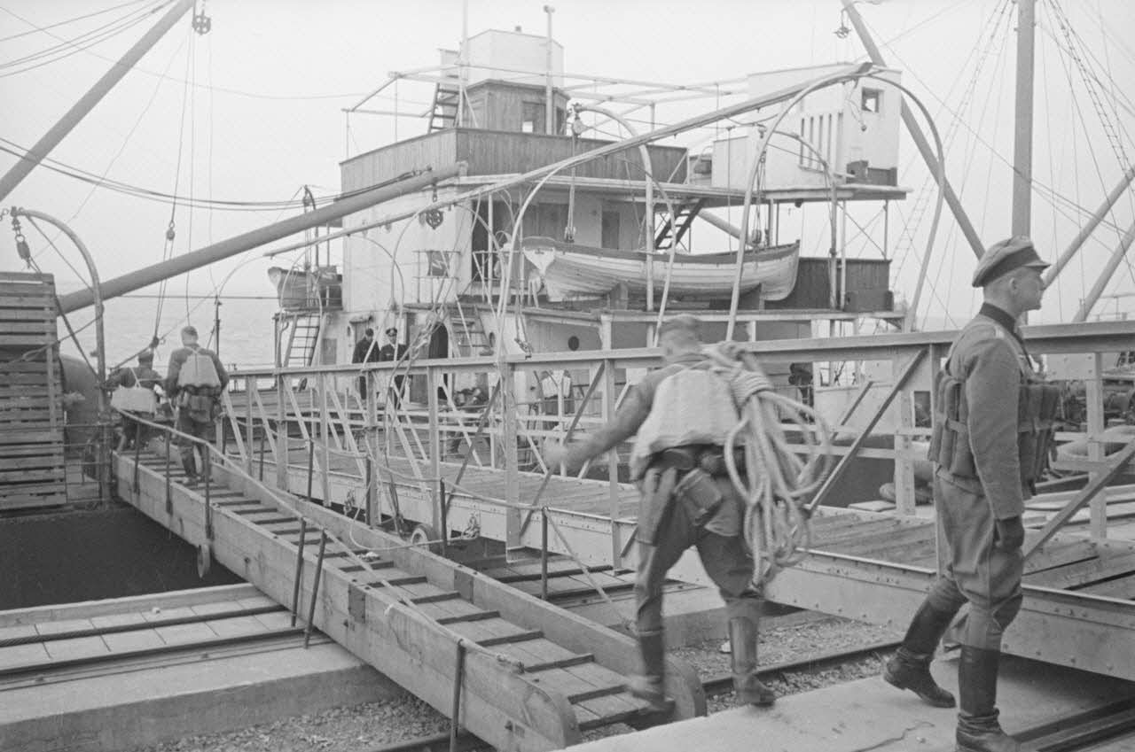 Dans le cadre de l'opération Seelöwe (lion de mer), l'entrainement au chargement d'un cargo (infanterie et matériels).