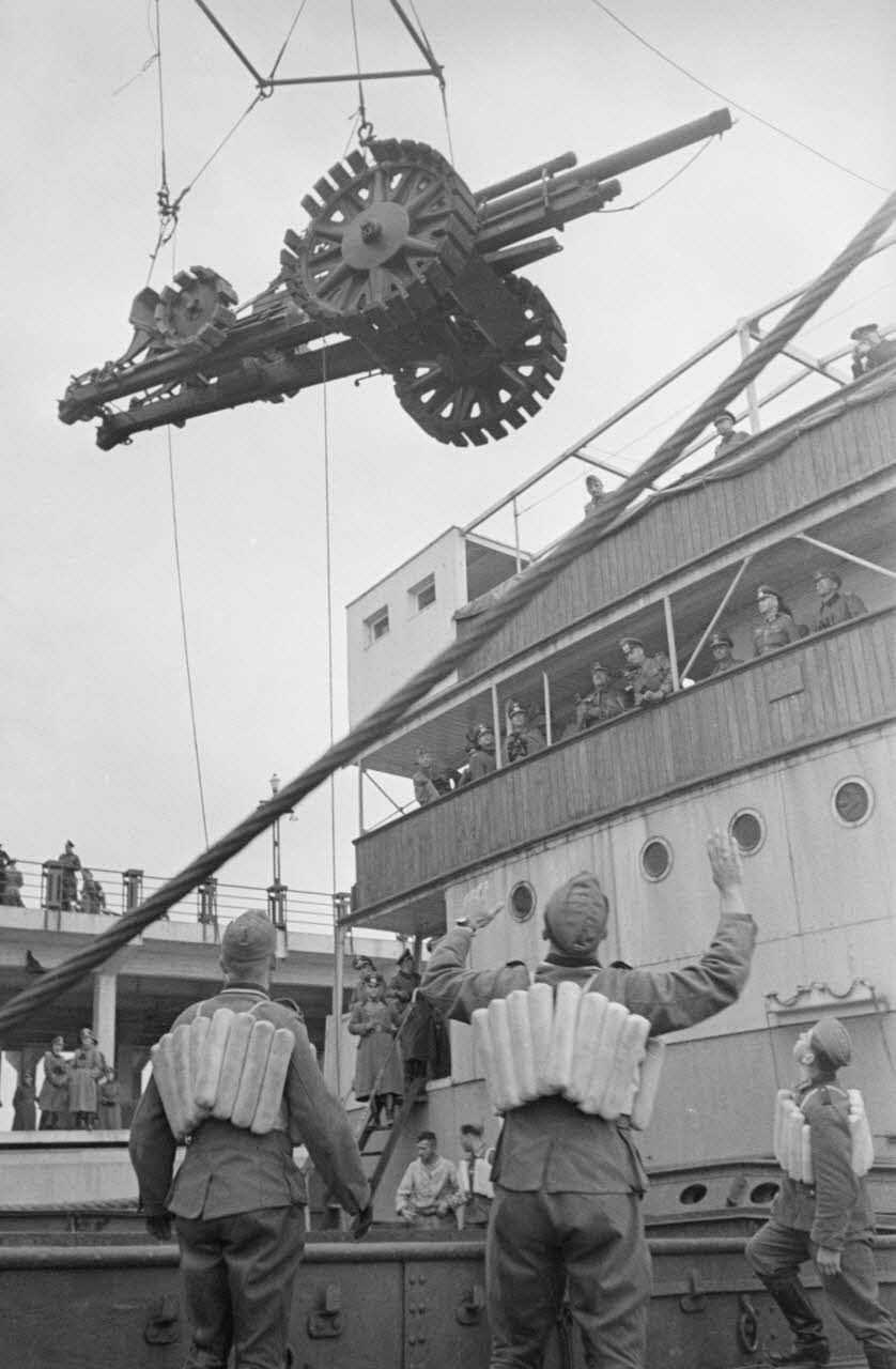 Dans le cadre de l'opération Seelöwe (lion de mer), l'entrainement au chargement d'un cargo (infanterie et matériels).