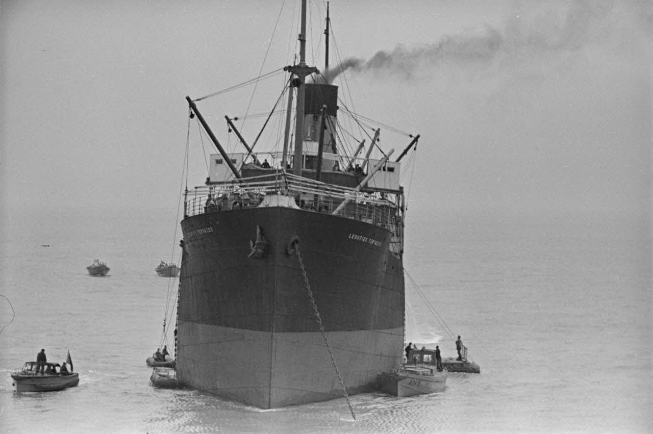 Déchargement de matériels d'artillerie (canon de 10,5 cm FH 18) depuis le navire d'origine grecque Leontios Teryazos.