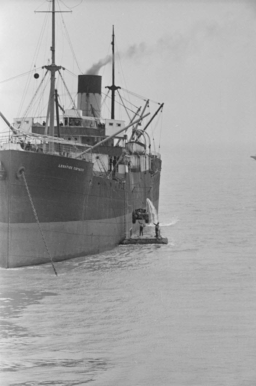 Déchargement de matériels d'artillerie (canon de 10,5 cm FH 18) depuis le navire d'origine grecque Leontios Teryazos.