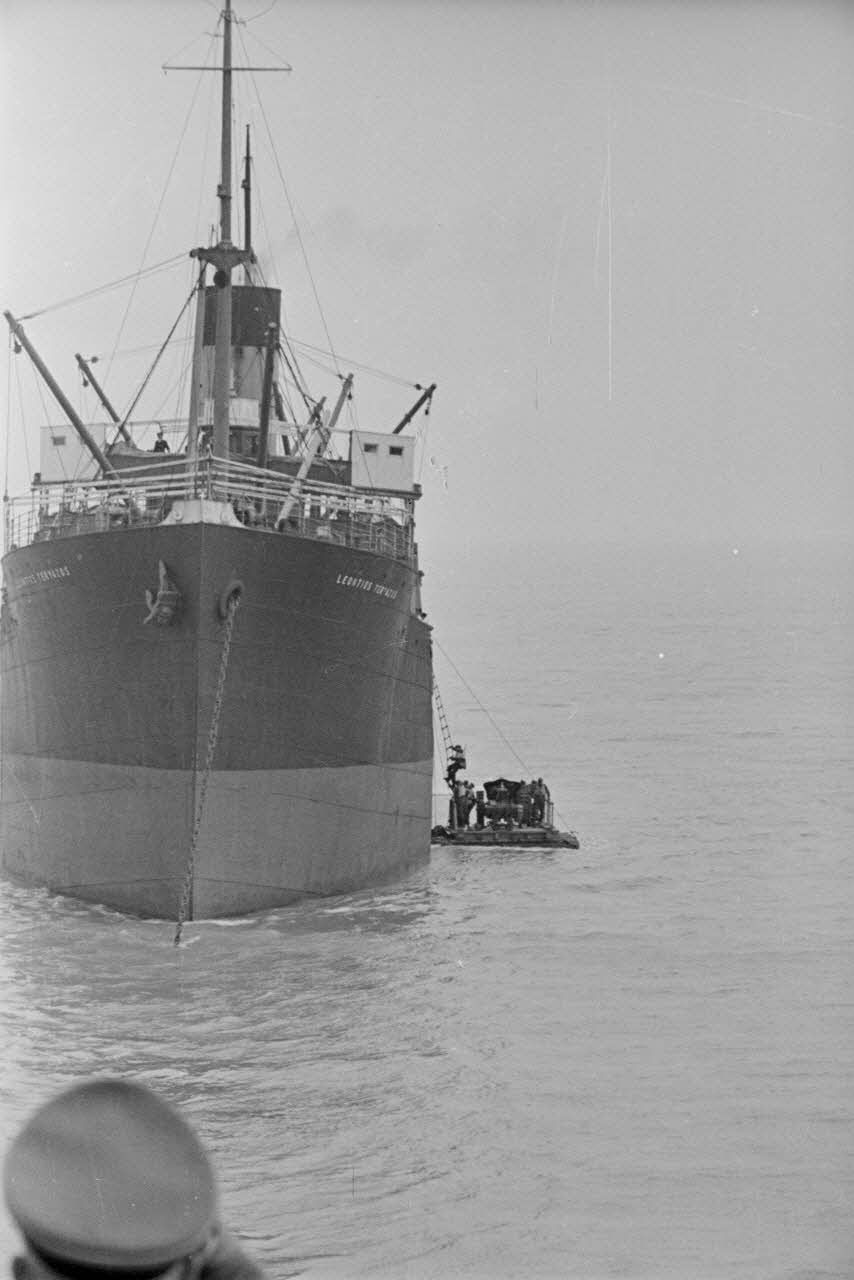 Déchargement de matériels d'artillerie (canon de 10,5 cm FH 18) depuis le navire d'origine grecque Leontios Teryazos.