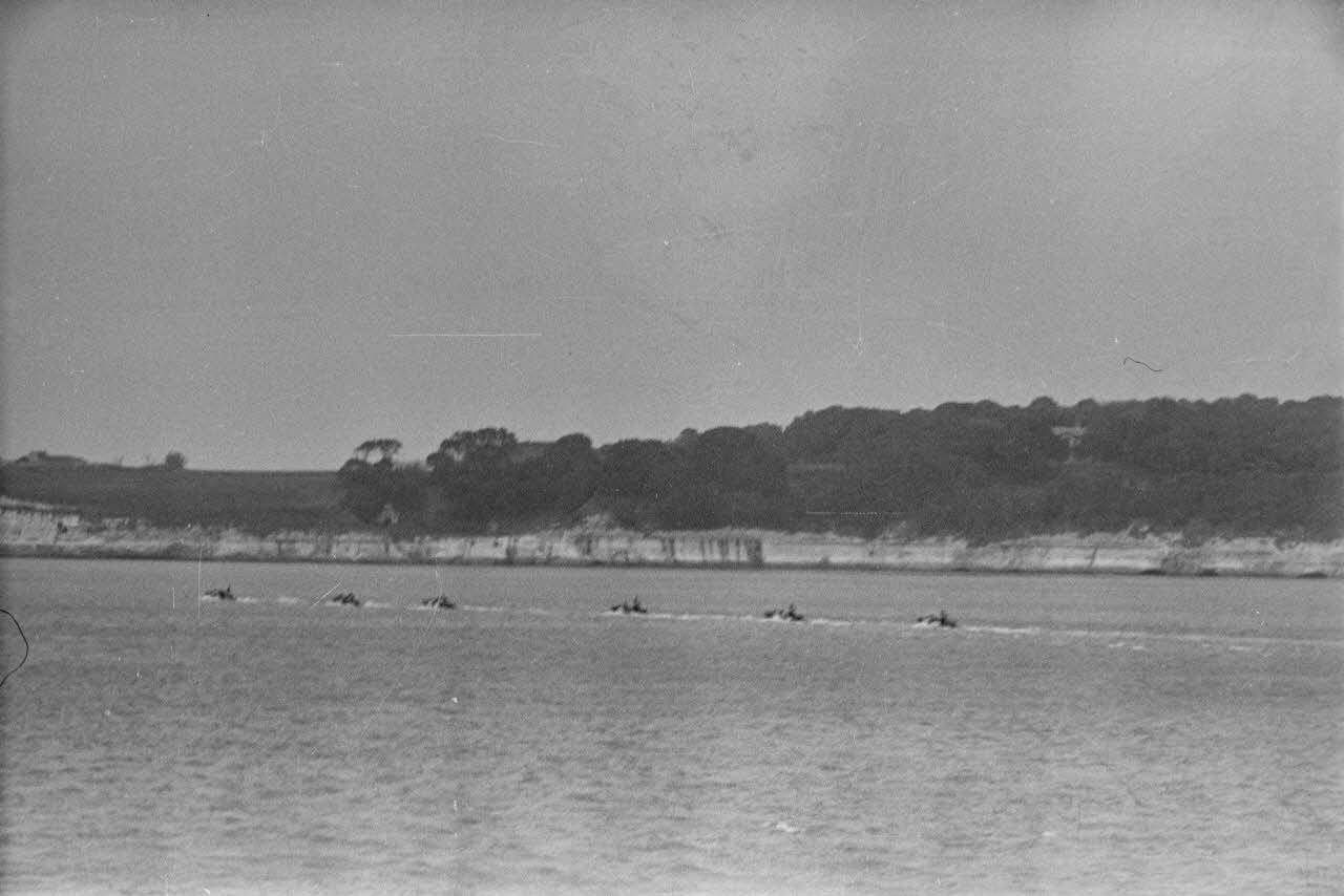 Progression de bateaux d'assaut allemands (Sturmboote) chargés de la protection des autres barges ou pontons de débarquement.