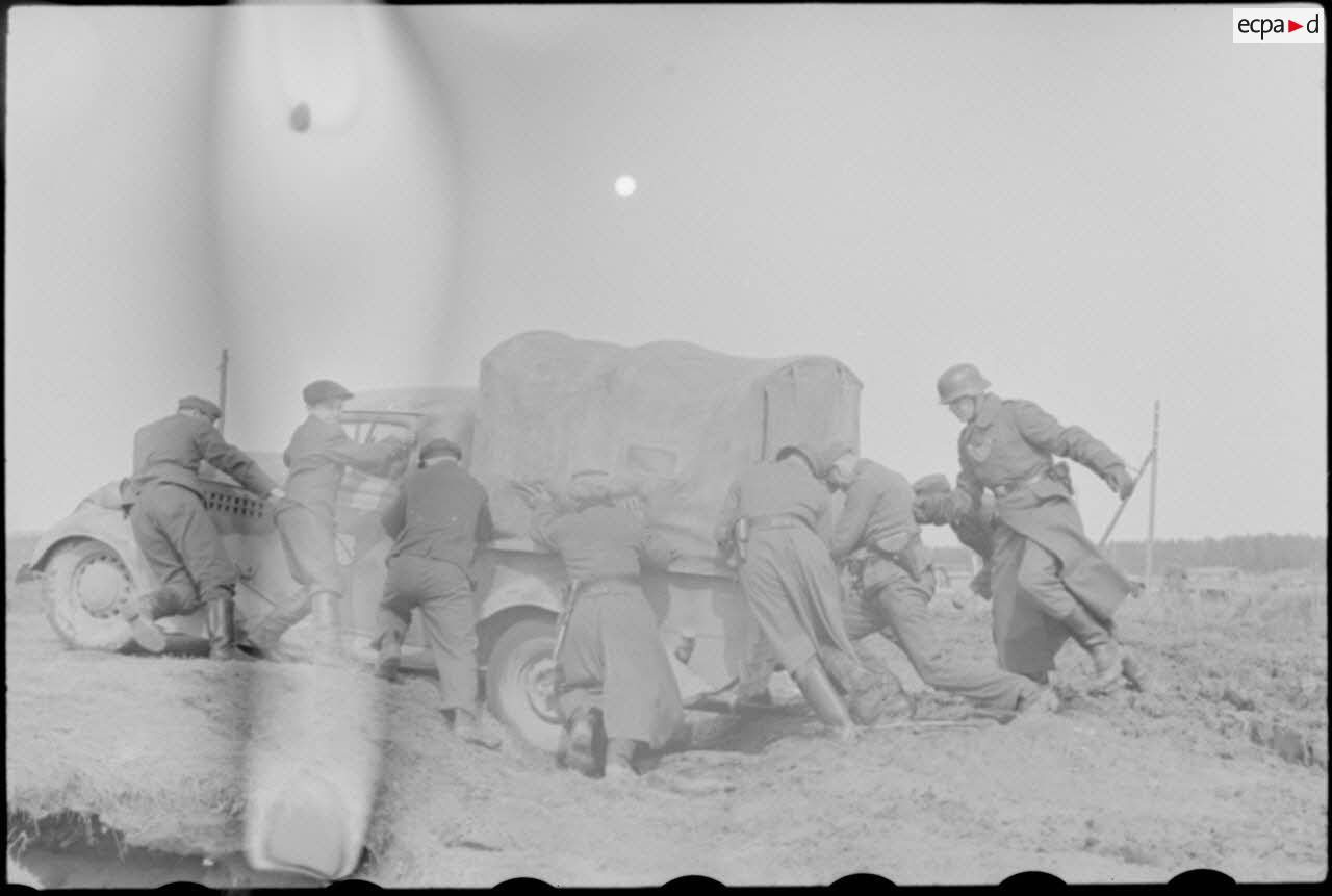 Une camionnette qui vient de s'embourber doit être poussée par des soldats.