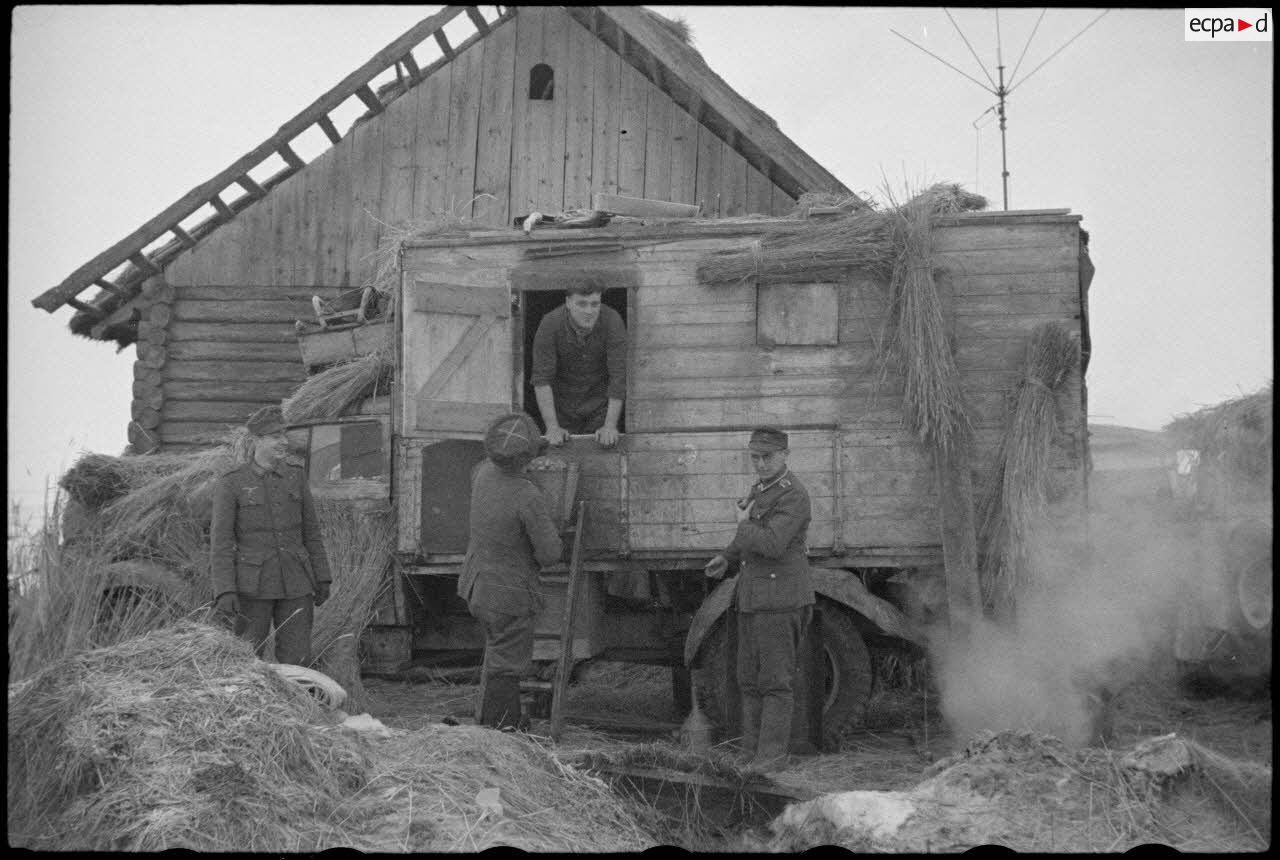 Un camion de transmissions de l'armée de l'air allemande, au premier plan on reconnaît la coiffure d'un cosaque.