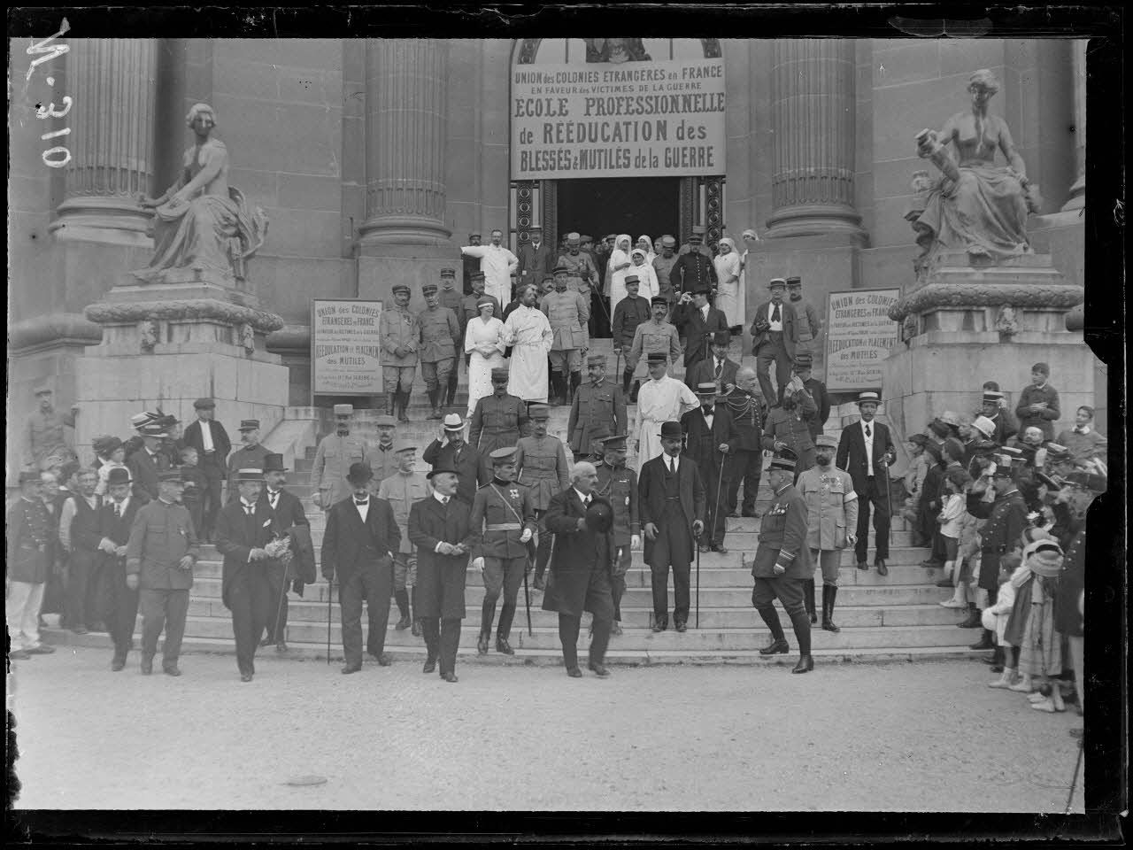 Le roi du Monténégro, Nicolas Ier, visite l'hôpital du Grand Palais en compagnie de Justin Godard, sous-secrétaire d'Etat au Service de santé. Ils rendent visite aux blessés.