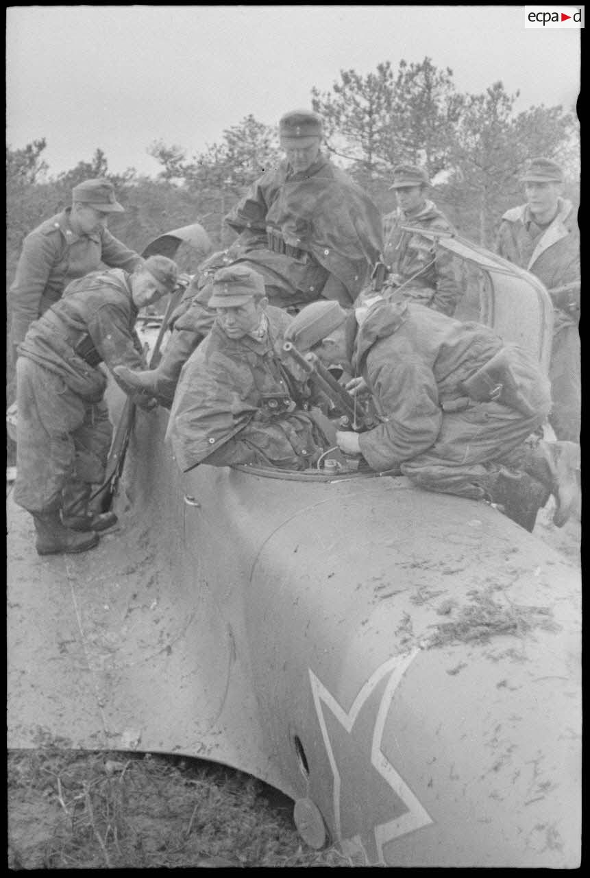 Un chasseur lourd Ilyushin IL-II "Sturmovik" crashé, des artilleurs du 519e et des reporters de la 697e compagnie de propagande examinent le chasseur.