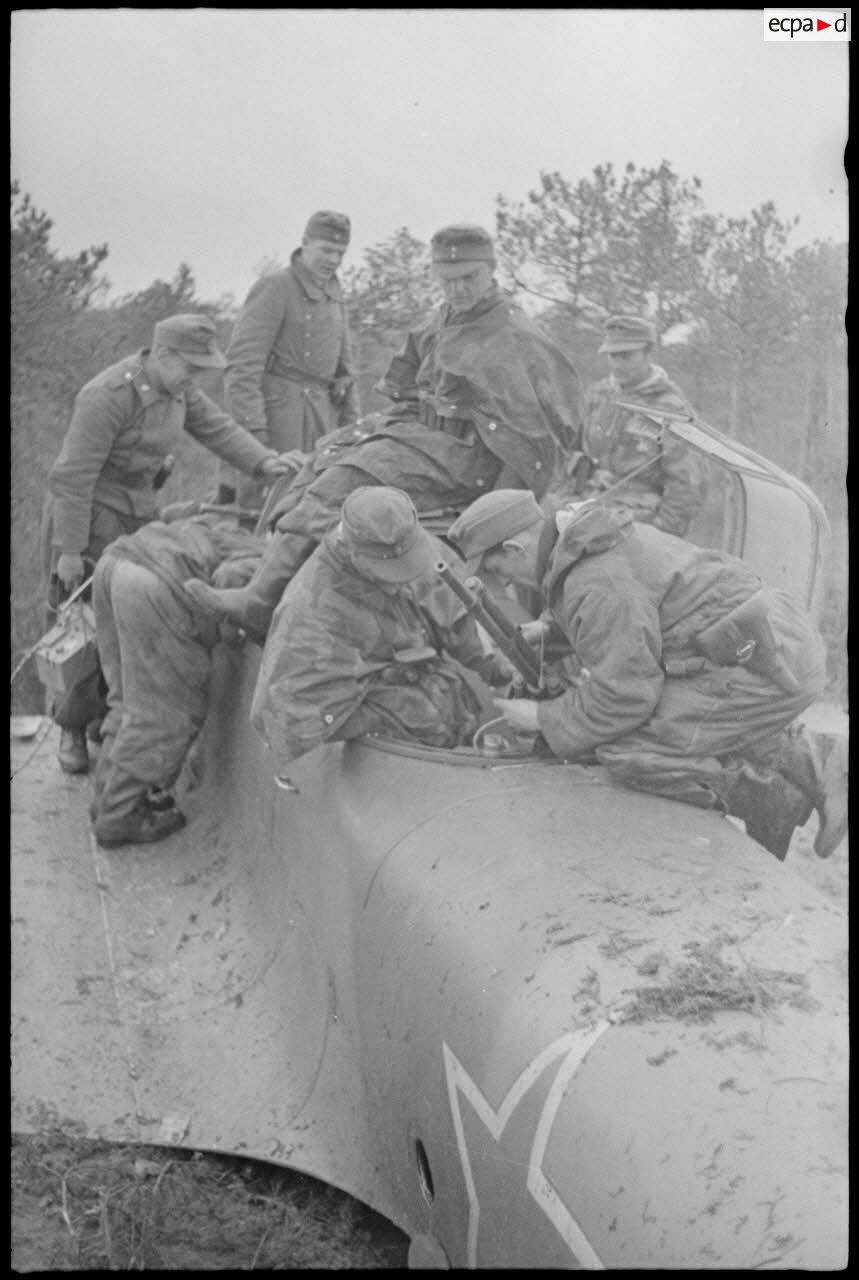 Un chasseur lourd Ilyushin IL-II "Sturmovik" crashé, des artilleurs du 519e et des reporters de la 697e compagnie de propagande examinent le chasseur.