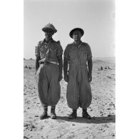 Dans un campement, des soldats australiens et anglais installent des mitrailleuses Vickers, aux…