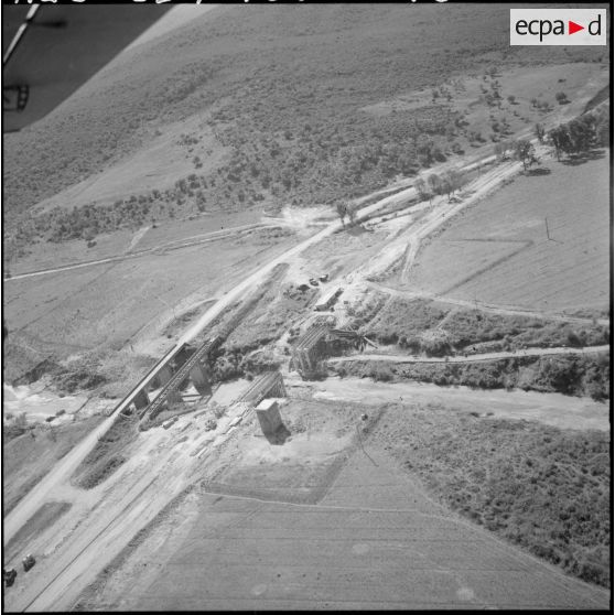 Vue aérienne du pont de l'oued-el-Kebir en reconstruction, entre Le Tarf et Yusuf.