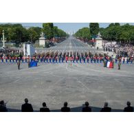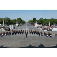 Mise en place des troupes à pied et motorisées sur le site Etoile/Champs-Elysées.