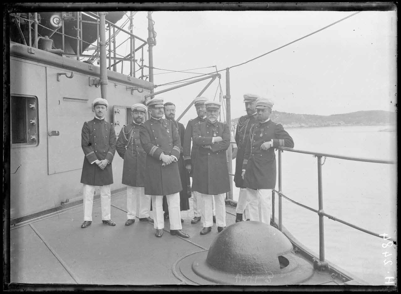 A bord du Jules Michelet. Etat-major du contre-amiral Charlier commandant la 2e division légère. [légende d'origine]