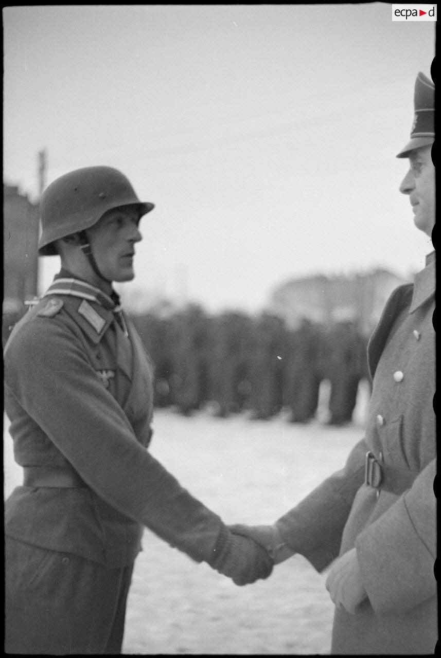 Le commandant (Major) Horst-Wolf Hoppe remet une décoration à un caporal, au centre le lieutenant de réserve Julius Stehler.