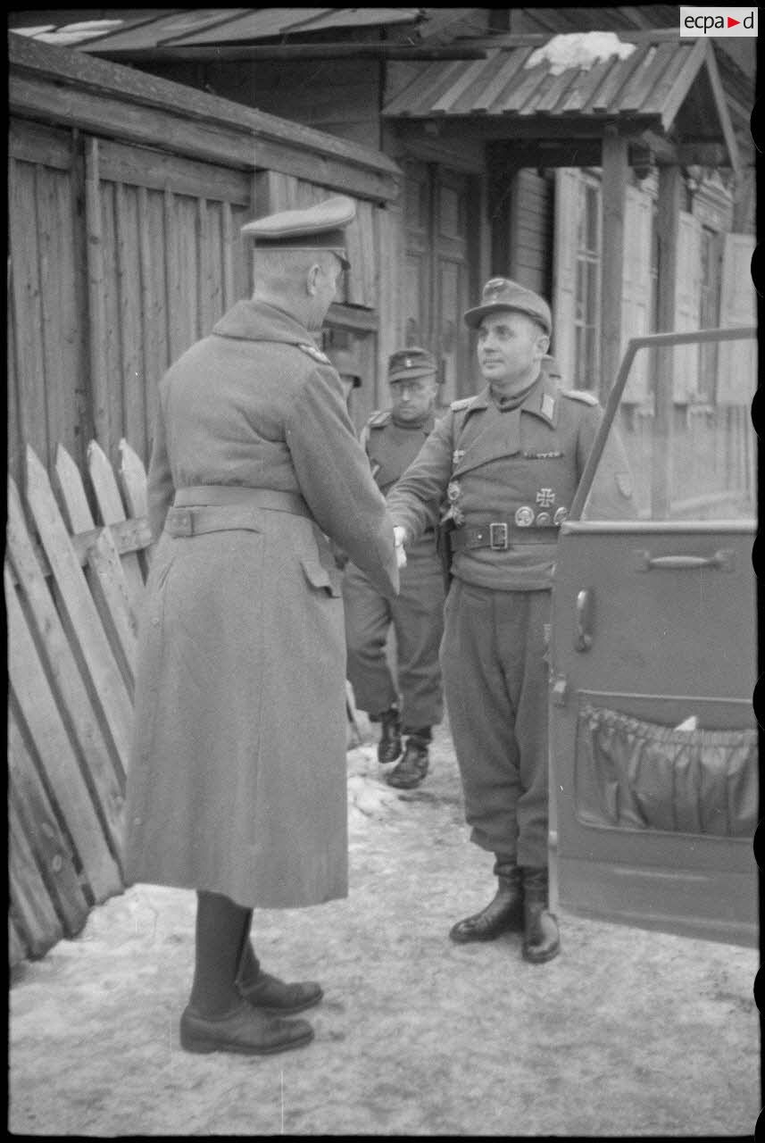 Le Major Hoppe salue le général Georg-Hans Reinhard à sa montée dans son véhicule.