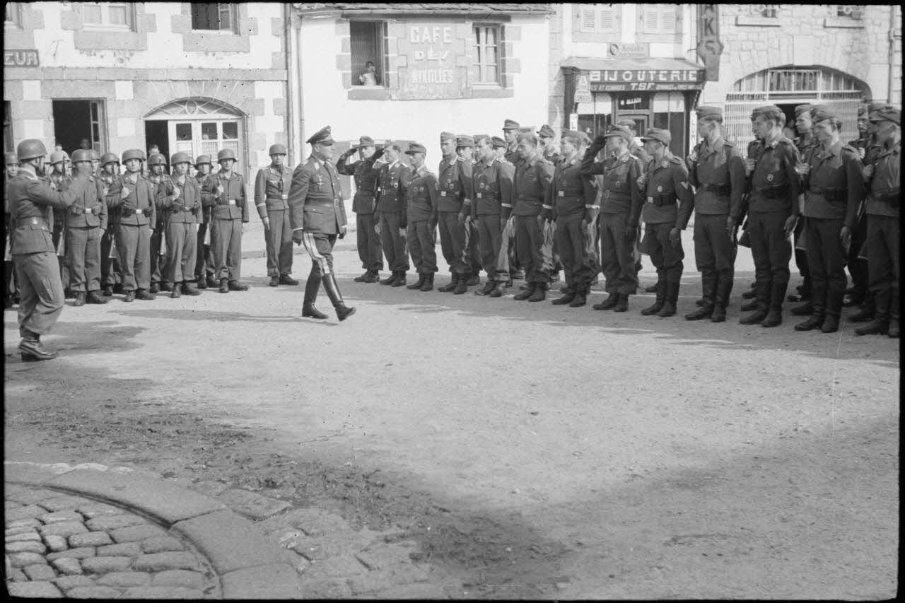 Un groupe d'officiers de la 3.Fallschirmjäger.Division lors d'une prise d'armes sur la place de Huelgoat (Finistère centre).