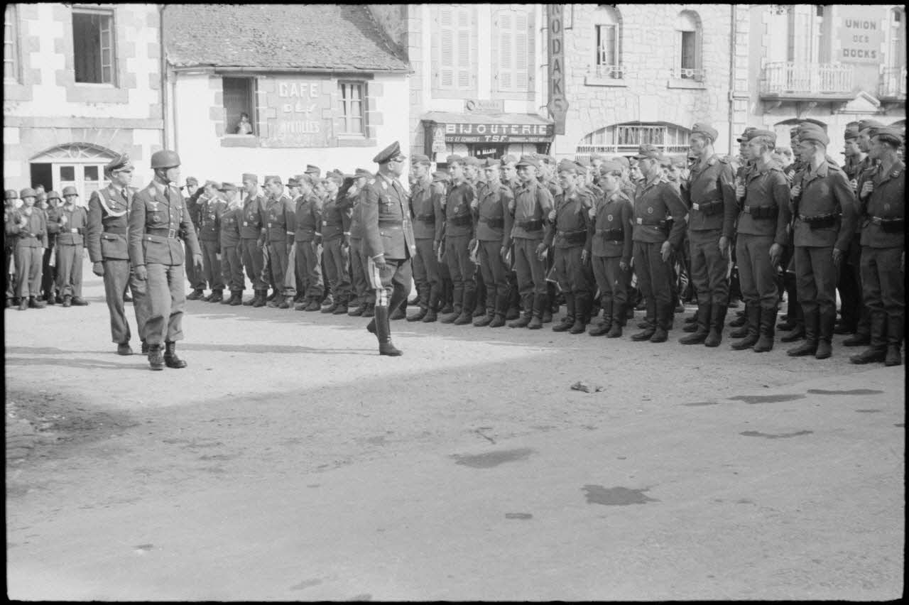 Un groupe d'officiers de la 3.Fallschirmjäger.Division lors d'une prise d'armes sur la place de Huelgoat (Finistère centre).