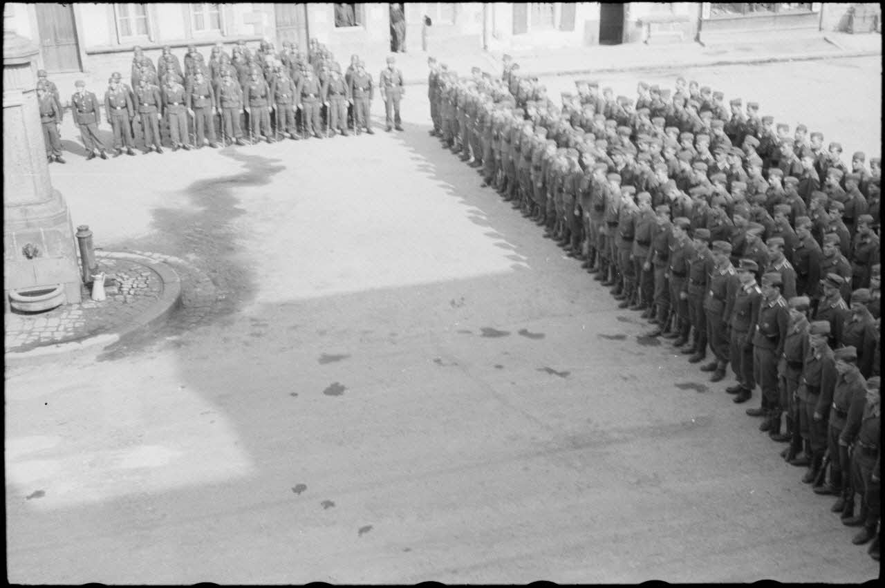 La place de Huelgoat lors d'une prise d'armes de l'état-major de la 3.Fallschirmjäger.Division.