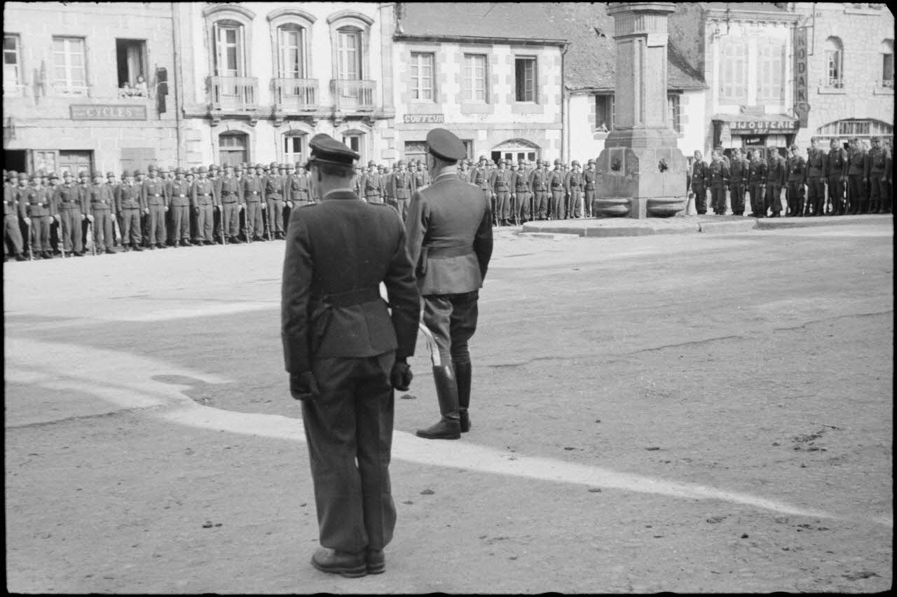 Un groupe d'officiers de la 3.Fallschirmjäger.Division lors d'une prise d'armes sur la place de Huelgoat (Finistère centre).