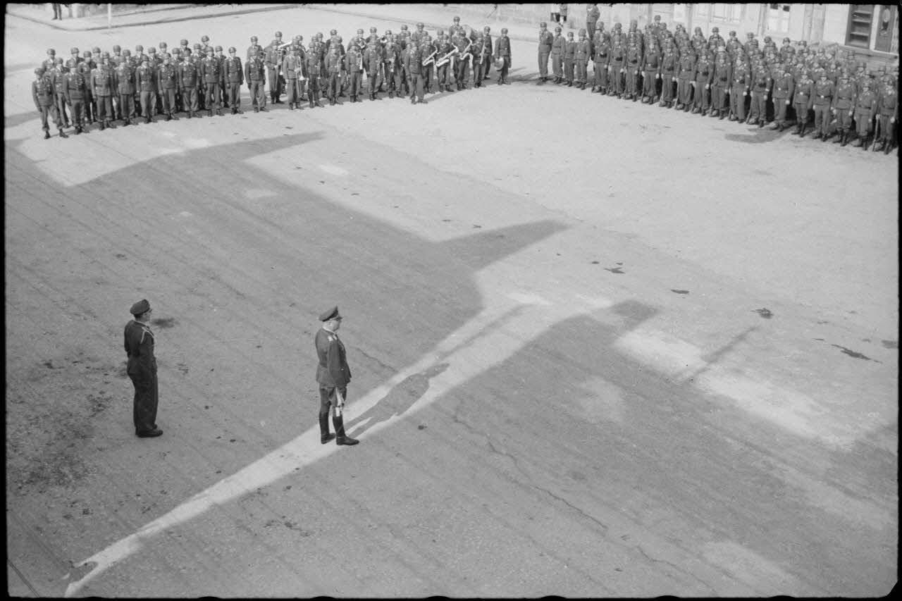La place de Huelgoat lors d'une prise d'armes de l'état-major de la 3.Fallschirmjäger.Division.