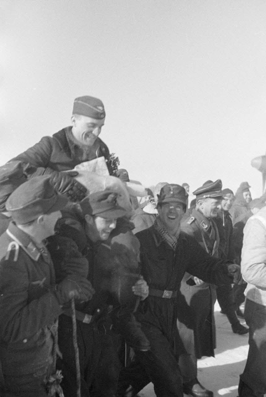 L'accueil réservé au pilote Hans Rudel pour le retour de sa 1 000e mission aérienne.