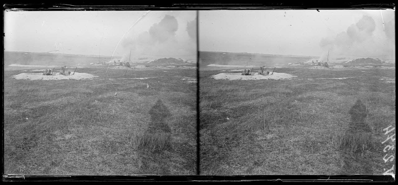 Sur le terrain de manoeuvres du camp de Mourmelon, des soldats sont à l'instruction. Ils apprennent à défendre un terrain en exploitant les trous d'obus comme abri. Des soldats exercent au tir au lance-grenades VB (Vivien Bessières) depuis ces trous d'obus.