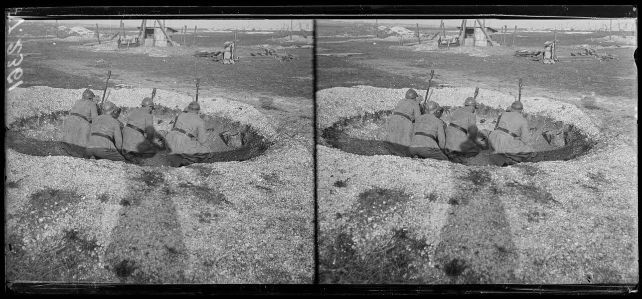 Installée dans la zone étendue à l'est de Reims, la 4e armée commandée par le général Gouraud doit faire face aux futures offensives allemandes. Dans les environs du camp de Mourmelon, des soldats s'exerçent à organiser des trous d'obus pour les transformer en points de défense. Dans un trou d'obus organisé, trois soldats tirent au lance-grenades Vivien Bessières (lance grenades VB) sur des cibles du champ de tir.