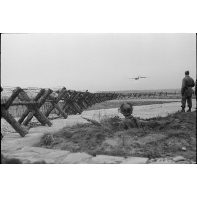 Pour les besoins d'un exercice aéroporté, le personnel au sol du Luftlandegeschwader 1 (8.LLG 1) positionne des barbelés devant la tour de contrôle d'un terrain d'aviation.