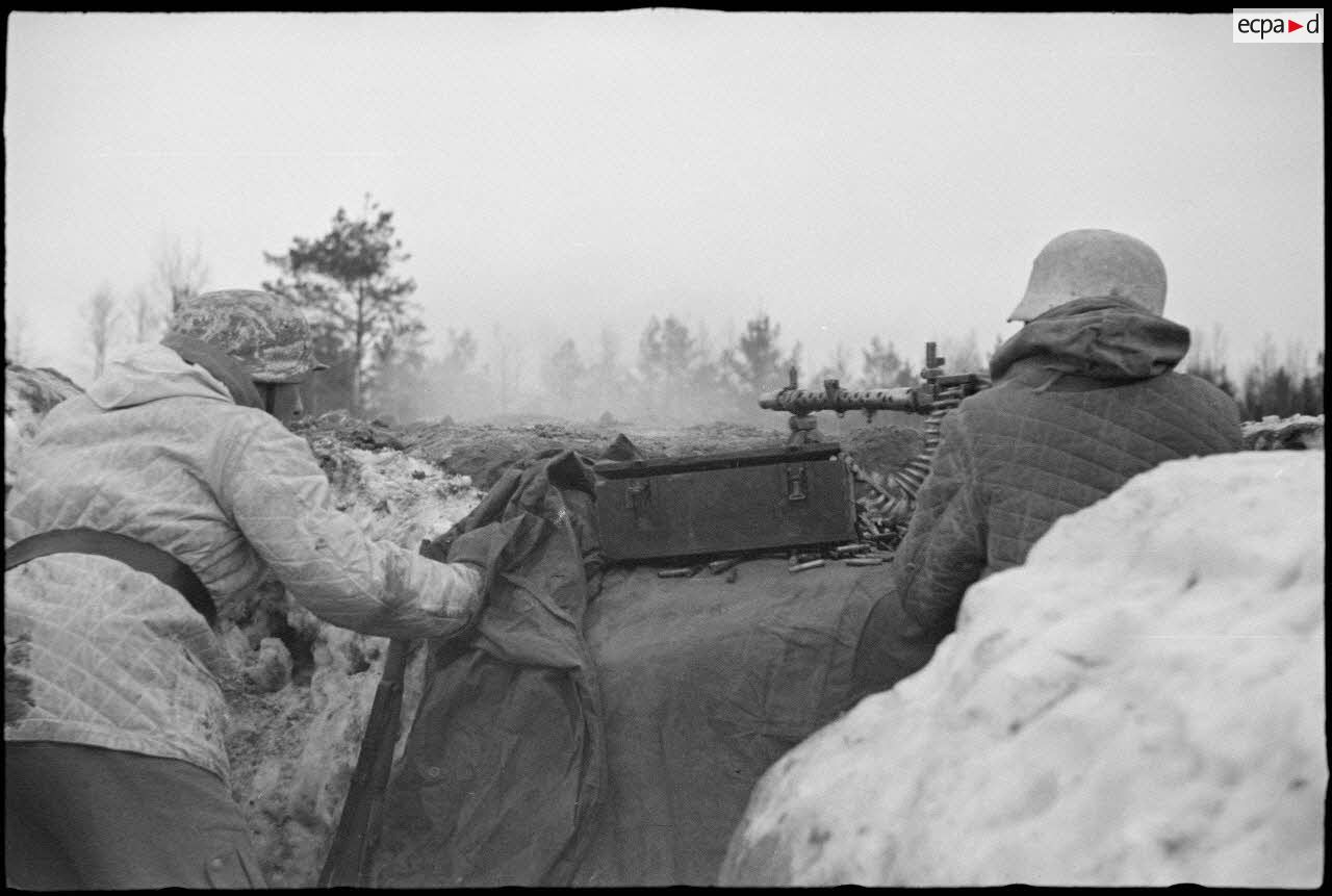 Tireur et pourvoyeur derrière une mitrailleuse MG-34 en pleine action.