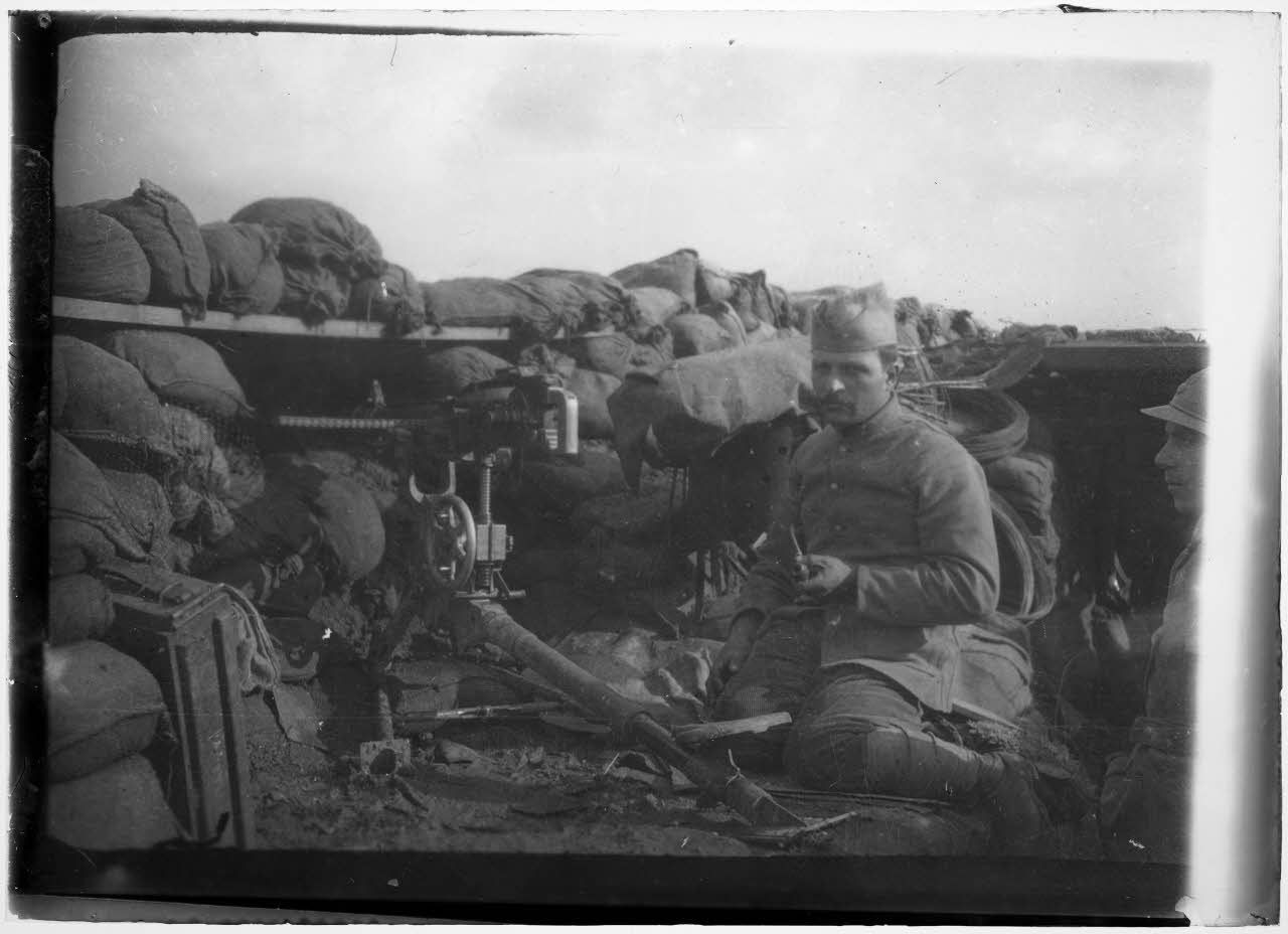 Soldats dans une tranchée, devant une mitrailleuse Saint-Etienne.