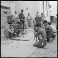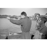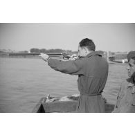 Devant des caisses alignées comme une pour en faire une barrière, des soldats de l'armée allemande…