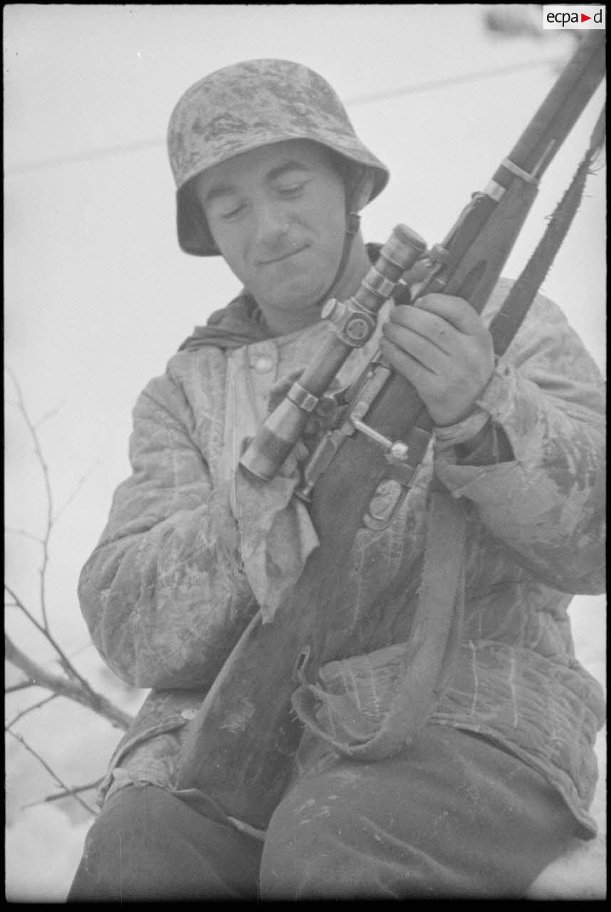 Un fantassin de l'armée de l'Air allemande utilise un fusil soviétique Vintovka capturé.