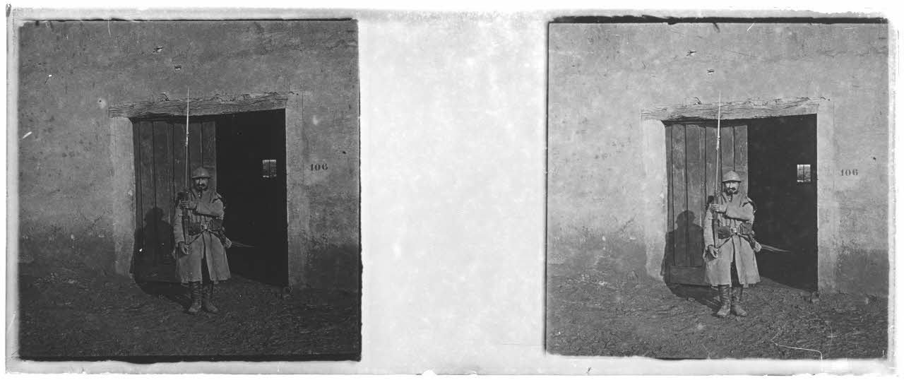 D169-1-41. Observateur d'artillerie [illisible]. NB : la légende de cette photographie, inscrite sur l’espace entre les deux vues stéréoscopiques, est difficilement lisible.