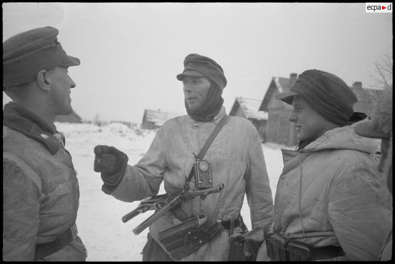 Avant un assaut, alors que les servants d'une batterie de mortiers installent une position, les équipages de Nashorn du schwere Panzerjäger-Abteilung 519 patientent à l'abri d'une meule de foin. Au sein d'un véhicule de commandement de l'Abteilung 519, des officiers étudient les plans de l'attaque. Des fantassins discutent et un tankiste de l'Abteilung 519, on reconnaît les pattes de col du tankiste. A proximité d'une isba, le reporter photographie un poste émetteur installé sur un traîneau et une femme. L'équipage du Nashorn (Sd.kfz.164) baptisé "Berlin" s'entretient avec le lieutenant de réserve (Oberleutnant der Reserve) Stehler (PK697 F955 L22 et L23). Un semi-chenillé sanitaire (Sd.Kfz.251/8) progresse sur une route. Un canon antichar de 7,5 cm Pak 40. A l'intérieur d'une isba, le lieutenant (Oberleutnant) Albert Ernst, commandant la 1ère compagnie du schwere Panzerjäger-Abteilung 519 est au téléphone en présence du lieutenant Stehler. Ce dernier quitte les lieux à bord d'un side-car BMW (R 75 ?).