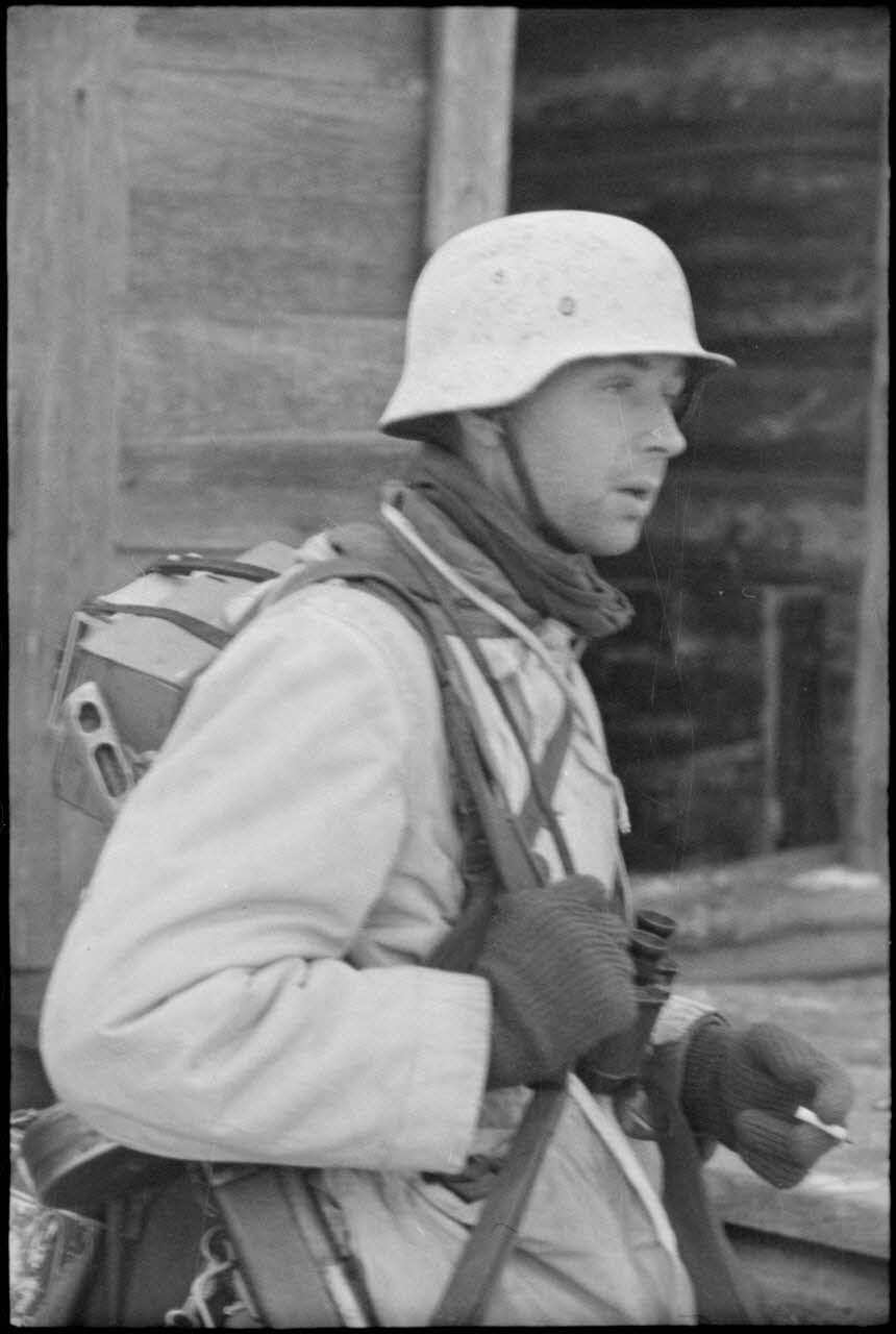 Lors de la bataille de Witebsk, un fantassin allemand, armé d'un pistolet-mitrailleur PPSH, fume derrière une isba.
