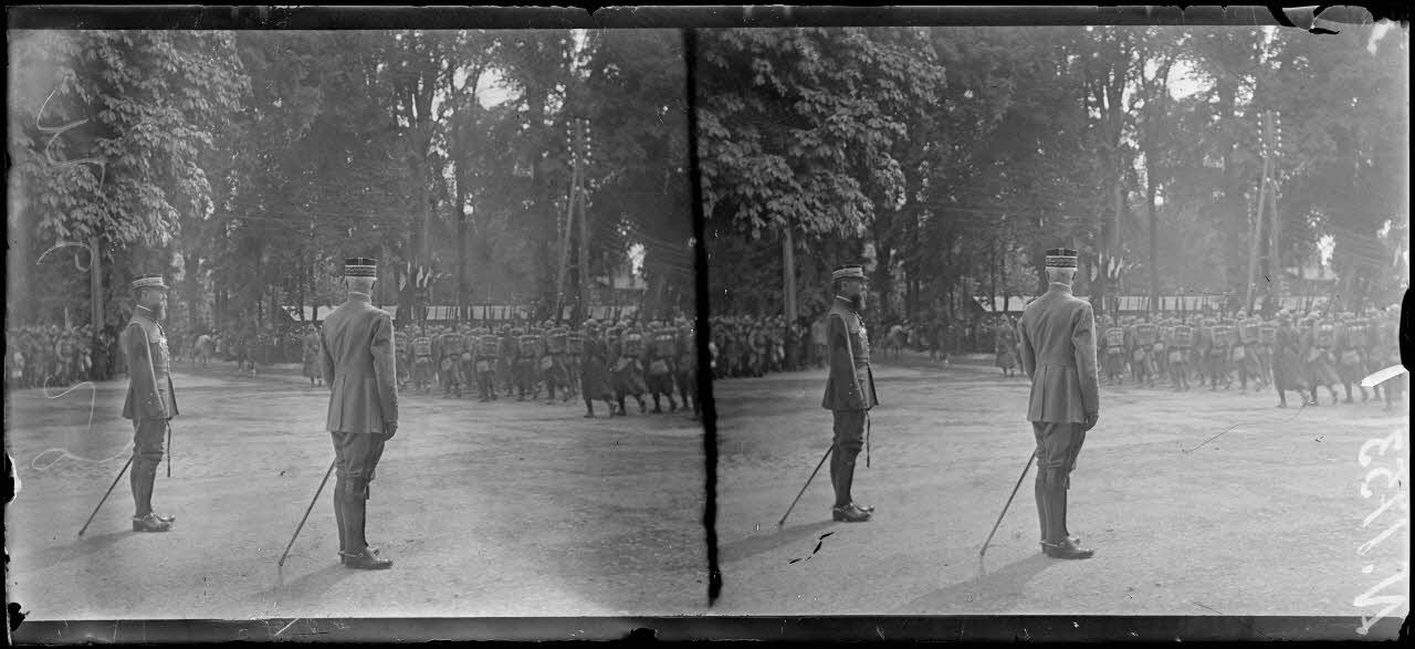 Un régiment d'infanterie passe devant le général Gouraud, commandant la 4e armée et le général Fayolle, commandant le groupe d'armées du centre.