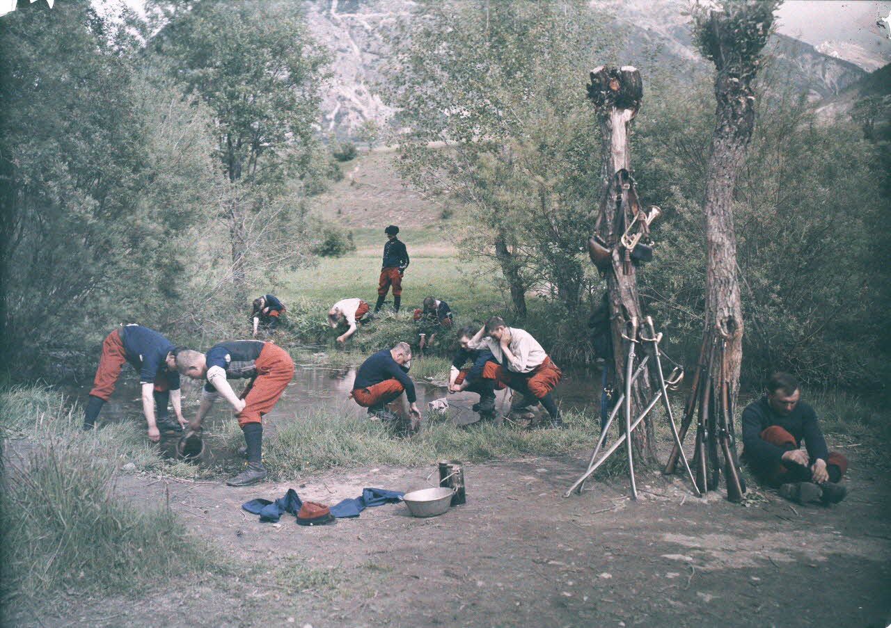 La date et le lieu sont inconnus. Cependant l'affectation de l'auteur dans l'unité photographiée permet de situer la photo entre août 1914 et novembre 1916, et le pantalon rouge, remplacé progressivement par le couvre pantalon bleu à partir de 1915, constitue un autre indice chronologique.