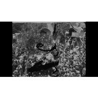 Une foule de parisiens assiste à la cérémonie depuis les balcons.