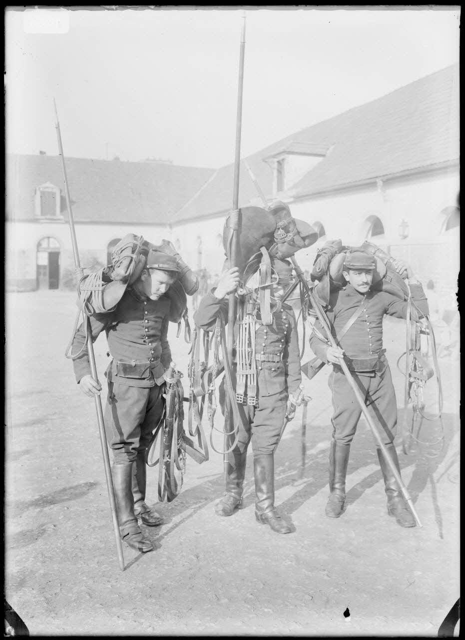 Cavalerie - Trois dragons portant leurs lances et leurs équipements de sellerie dans la cour de la caserne. [légende d'origine du cliché D146-1-59]