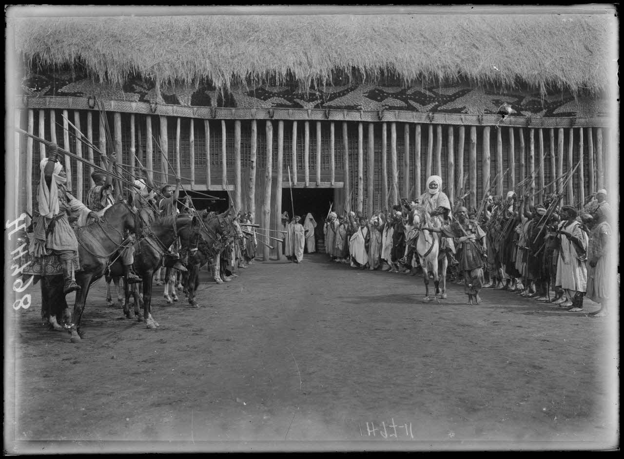 Le roi Njoya, sultan des Bamoun, sort du quartier royal entre deux rangées de guerriers à cheval brandisant leurs lances et formant une haie d'honneur.