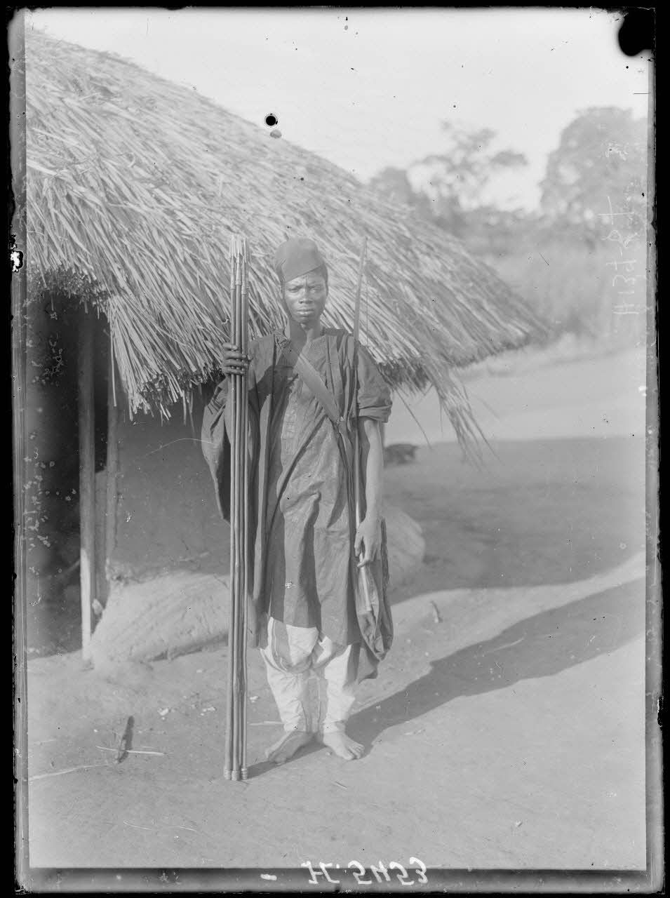 Un soldat de l'ethnie Bafeuk pose en costume de guerre avec son arc et ses lances devant une case du village de Bilanga-Kombé.