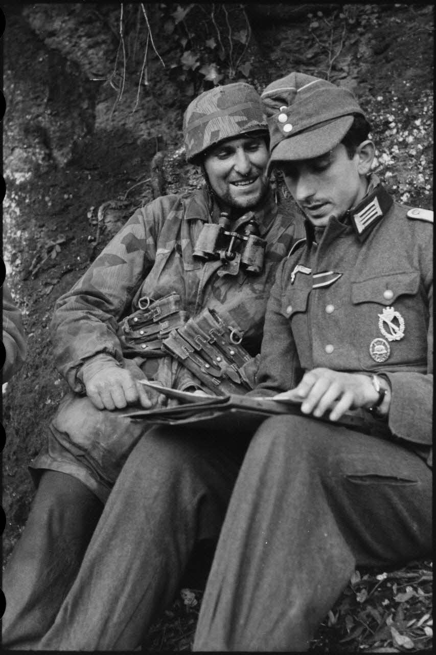 Au nord-ouest d'Anzio-Nettuno, un parachutiste de la 4.Fallschirmjäger.Division et un sous-lieutenant d'infanterie examinent une carte.