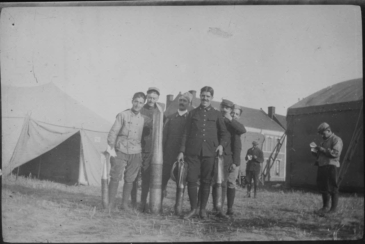 Photographie de groupe autour de bombes employées par les avions bombardiers.