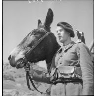 Un artilleur du 2e RAM (régiment d'artillerie de montagne) présente un mulet porteur de caisses de…