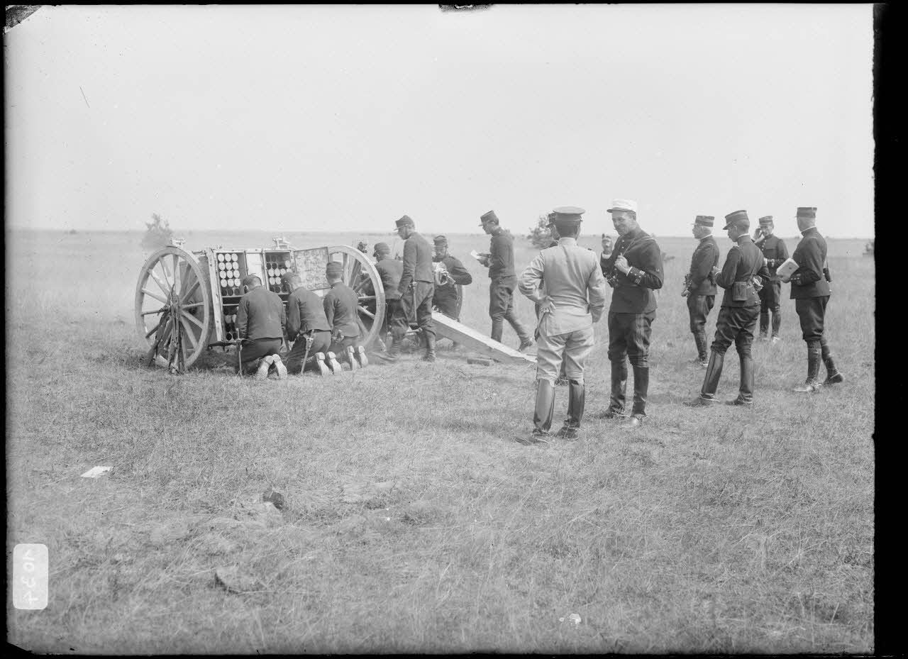 Artillerie - Les manœuvres du canon de 75 mm sous les yeux des officiers (et de l'officier japonais en visite).