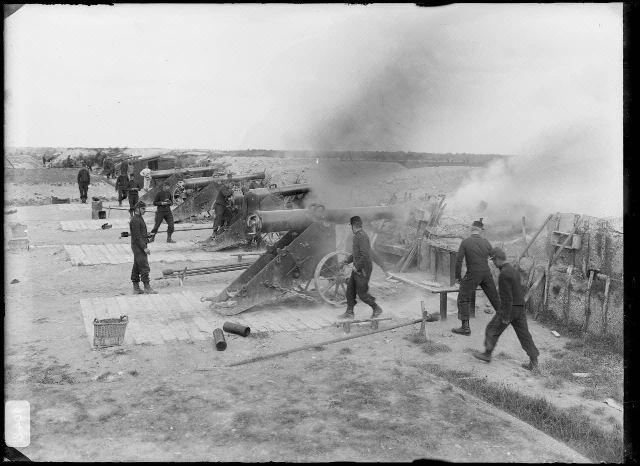 Artillerie - Les servants et les canons relevés dans le champ de manœuvres.