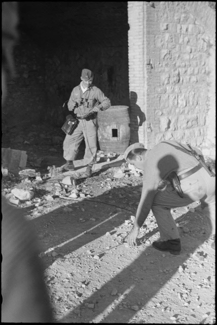 Dans une maison, deux fantassins de la Luftwaffe préparent la mise à feu d'une charge de démolition. La destruction d'une maison proche de la route principale couvrira la retraite des troupes allemandes en interdisant l'accès au village.