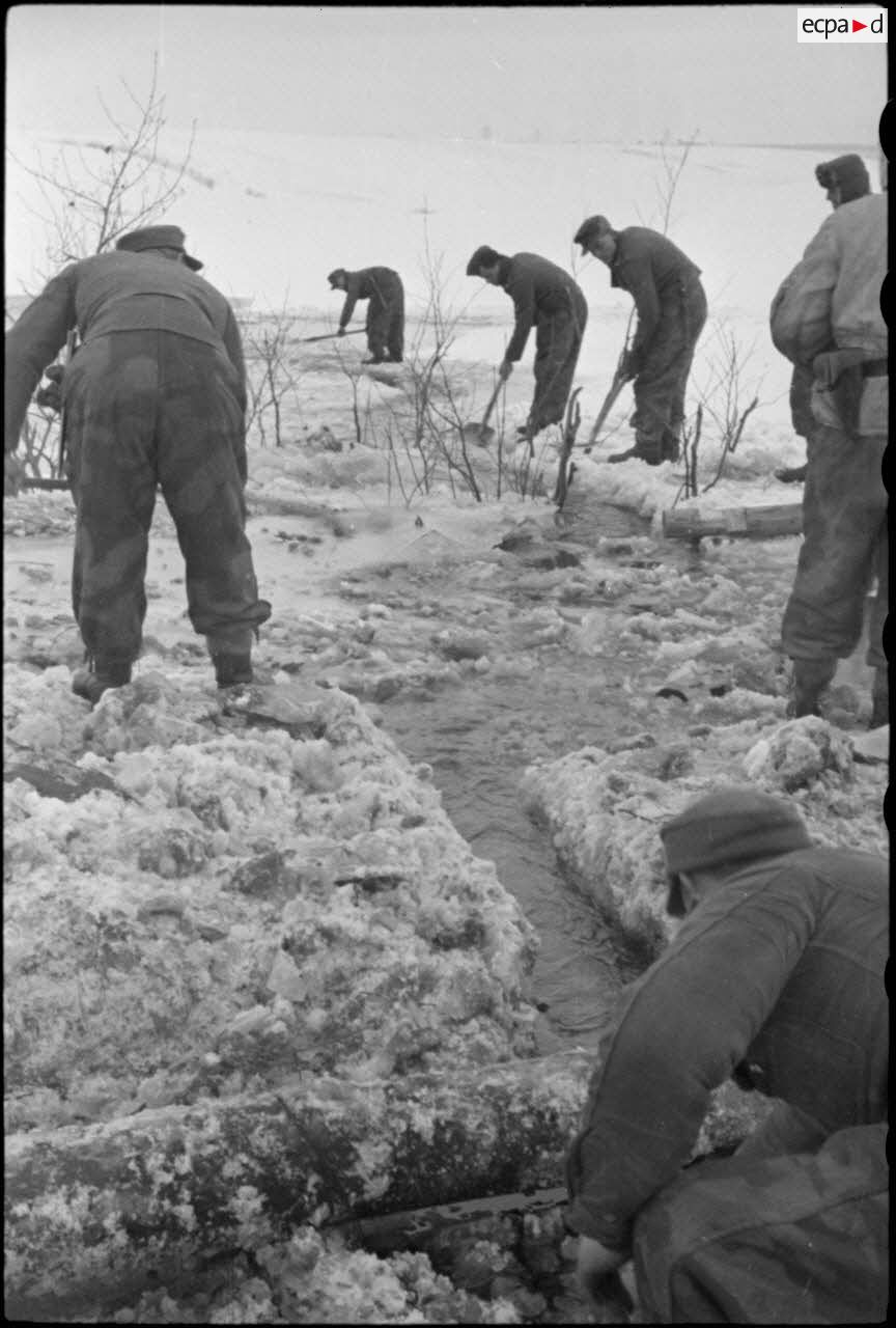 Pris dans la glace, les rondins qui consolidaient la route sont détruits à l'aide d'explosifs.